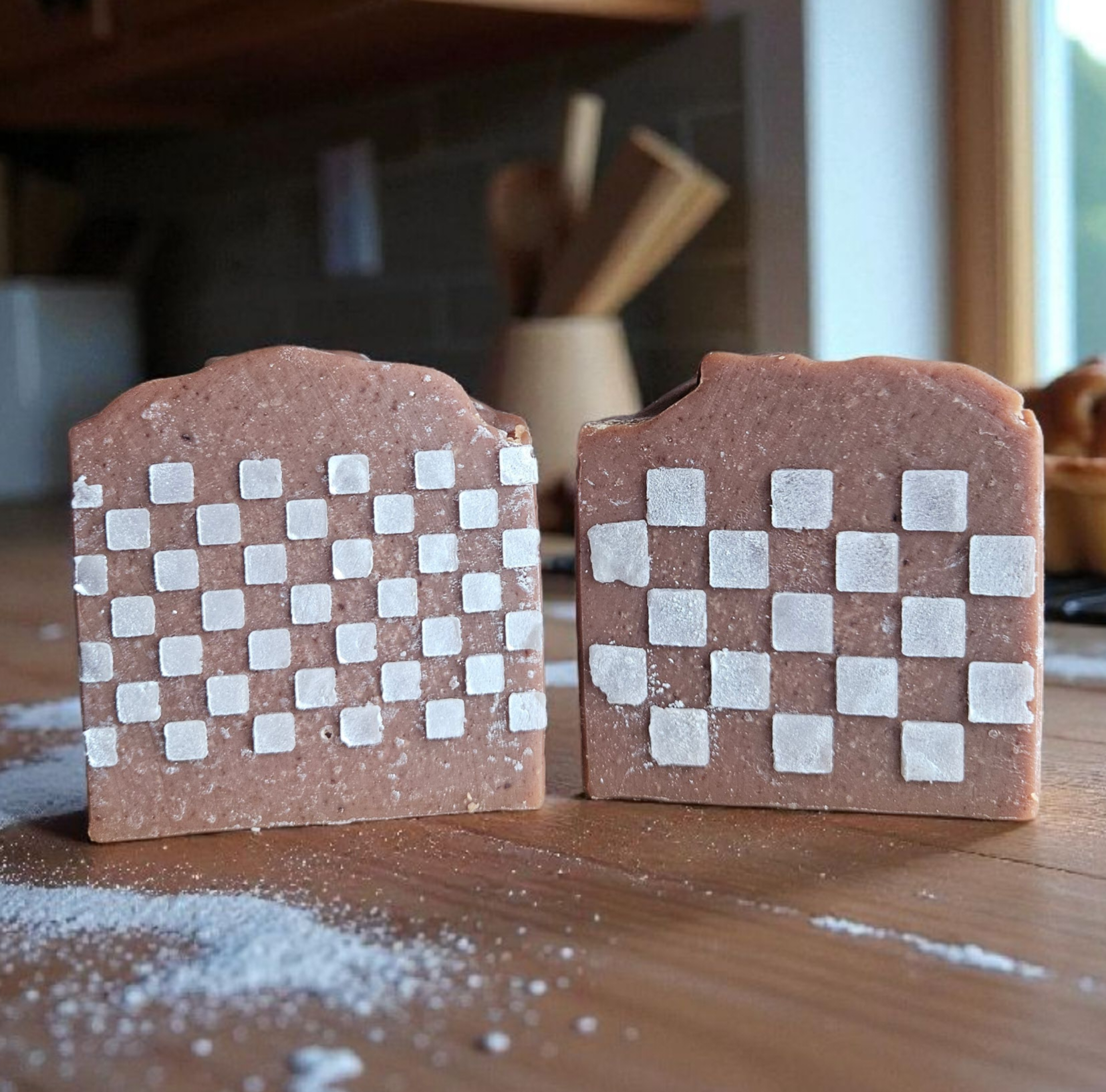 Each bar is a rustic reddish-brown with a hand-stenciled white plaid pattern, echoing the simple charm of a well-worn apron. Cozy, nostalgic, and sweet, Gingham Apron is a soap that captures the warmth of baking days and the comfort of home.